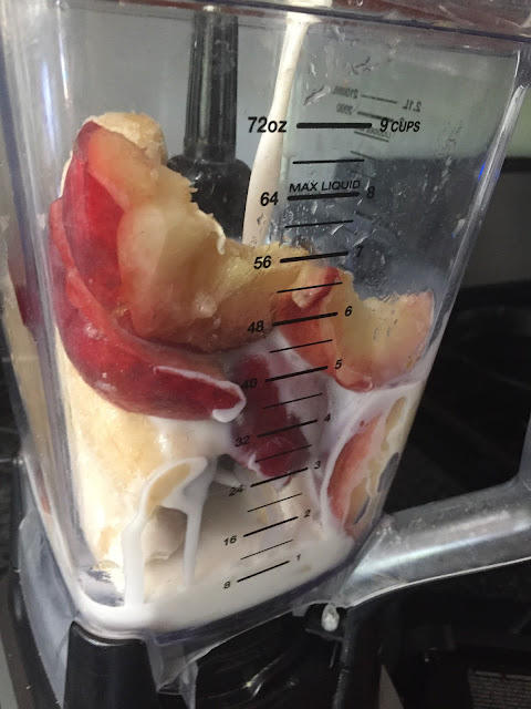 First, cut the peach and fill up a cup measurer with 1 1/2 of a cup of mile.