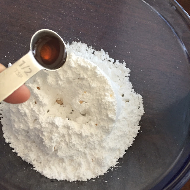 Start off with adding a cup of powdered sugar.Then add 1/2 of a tsp of vanilla extract.